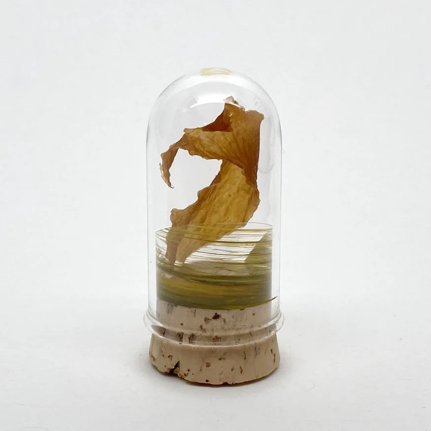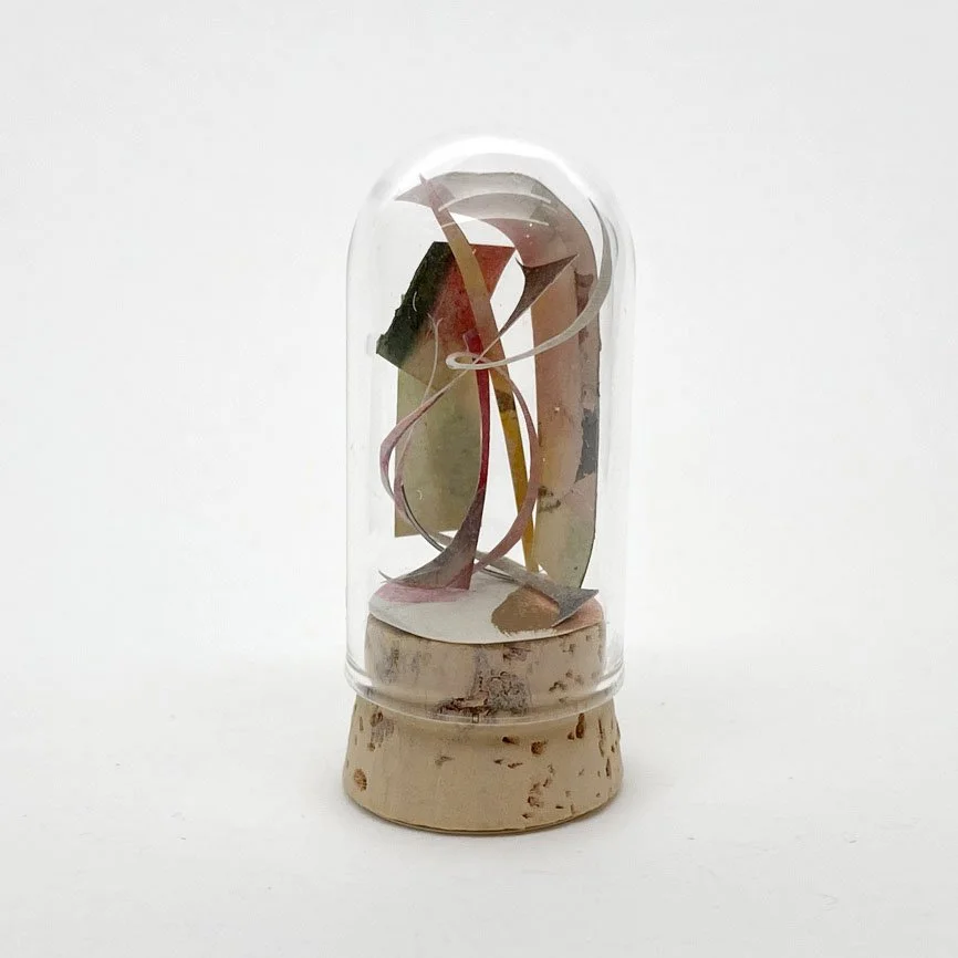 A piece of palette paper, a shaving of wood, a snip of paper or ribbon, a petal from a flower…I love to save and organize scraps from creative processes. I enjoy discovering unexpected connections between materials. Sometimes just the creative “dust” at the bottom of a pile becomes a WONDER WORLD. It is fascinating to me that by simply assembling these little collections in glass tubes brings focus and awareness to what is often overlooked; and evokes a feeling of curiosity for the world inside.